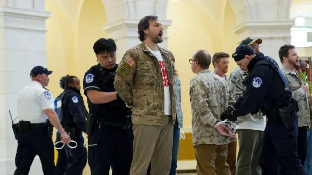 যুক্তরাষ্ট্রের সাবেক সেনা সদস্যরা ইরানে নতুন করে কোনো যুদ্ধ চান না। এই দাবির প্রেক্ষিতে ওয়াশিংটন ডিসিতে মার্কিন কংগ্রেস ভবনে বিক্ষোভ করেছেন তারা। সোমবার (২০ এপ্রিল) আয়োজিত এই বিক্ষোভে স্থায়ীভাবে ইরান যুদ্ধ বন্ধের দাবিতে সরব হন সাবেক সেনাসদস্যরা। অপ্রীতিকর পরিস্থিতির এক পর্যায়ে পুলিশ অন্তত ৬০ জনকে আটক করেছে।