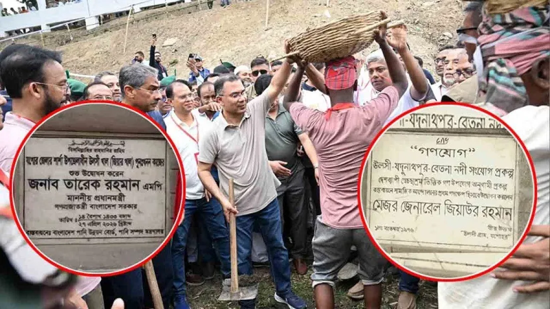 সদ্য উদ্বোধন করা নামফলকটিতে লেখা রয়েছে, ‘যশোর জেলার শার্শা উপজেলাধীন উলসী খাল (জিয়া খাল) পুনঃখনন কাজের উদ্বোধন করেন জনাব তারেক রহমান এমপি, মাননীয় প্রধানমন্ত্রী, ২৭ এপ্রিল, ২০২৬।’
